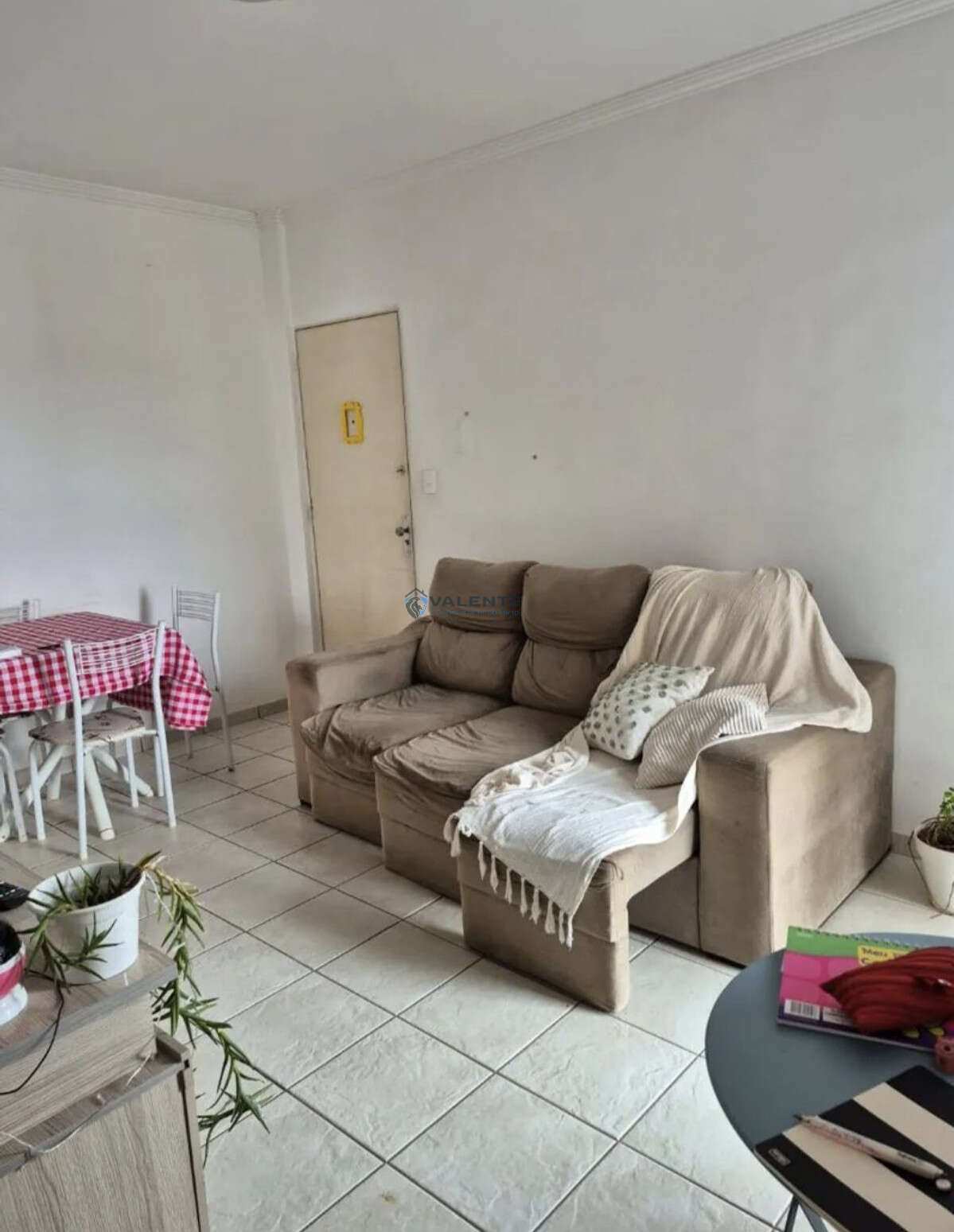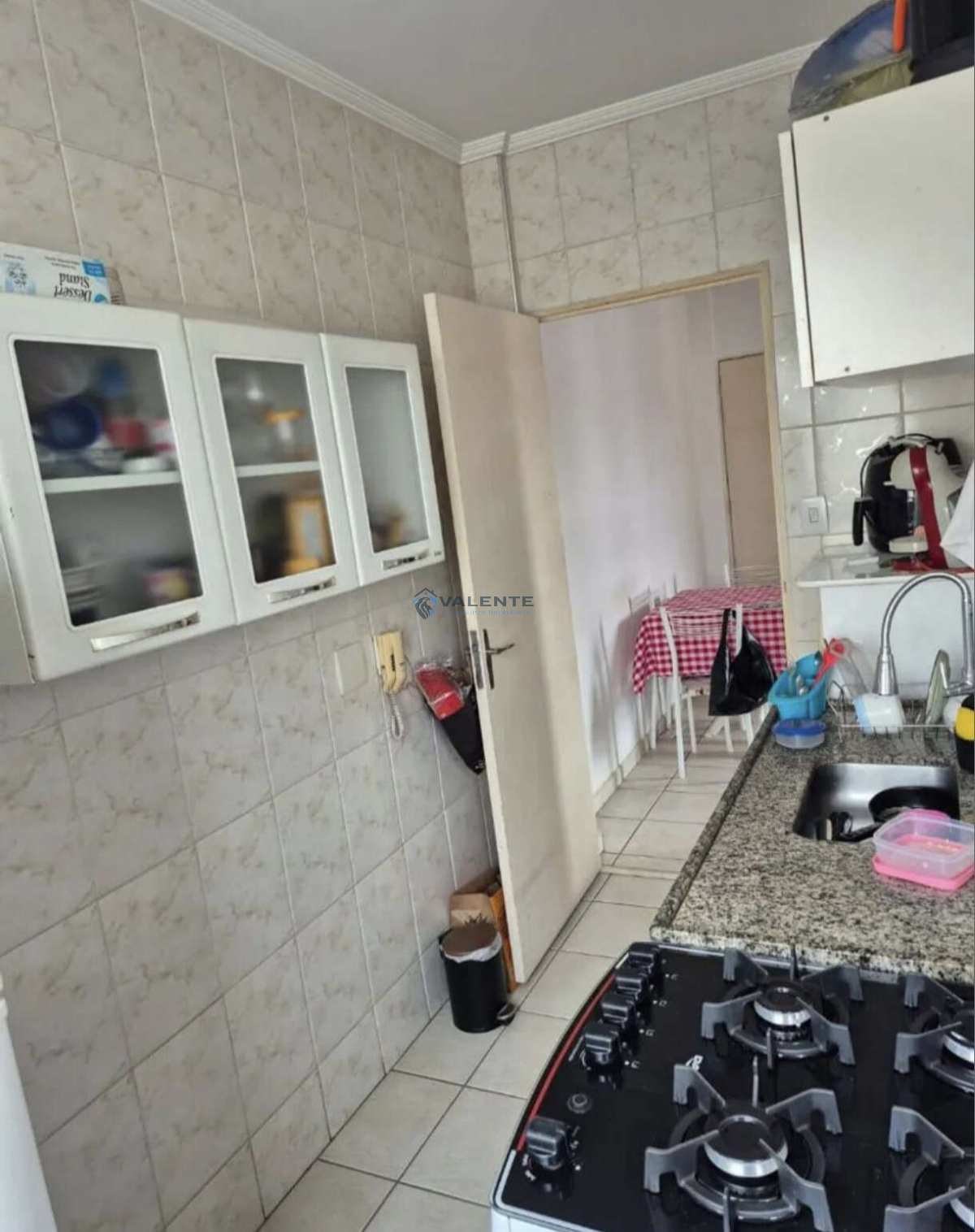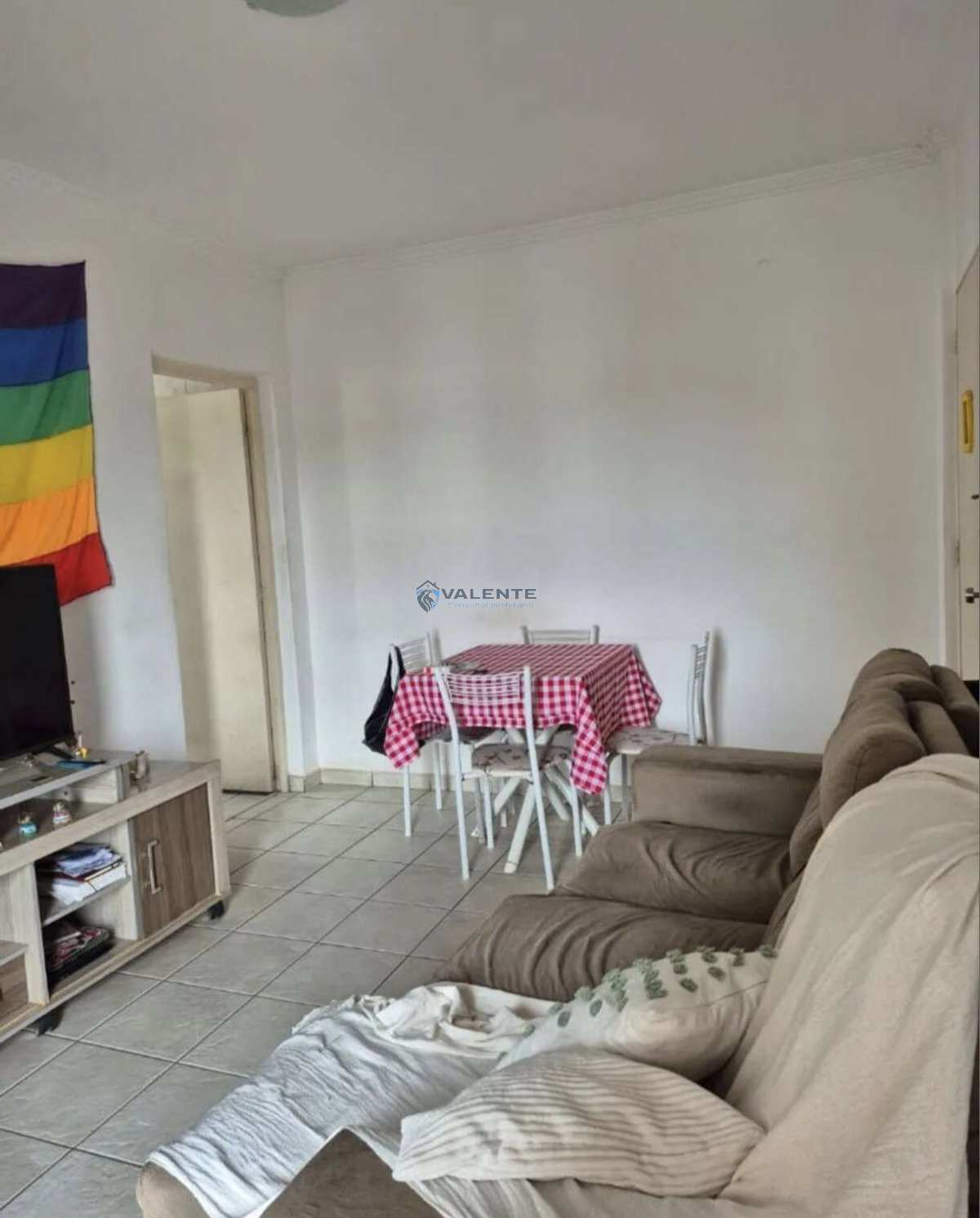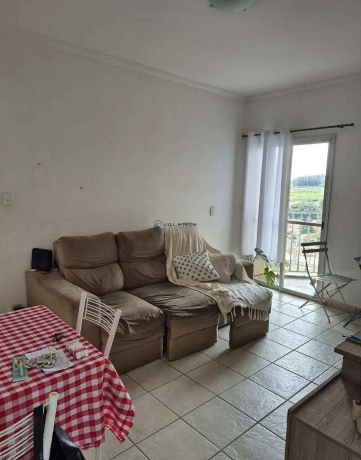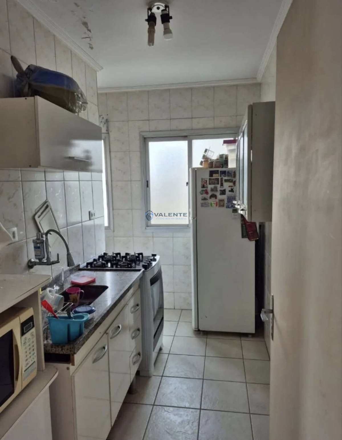Apartamento com 2 dormitórios, sala para 2 ambientes com sacada, cozinha, área de serviço e 1 banheiro.