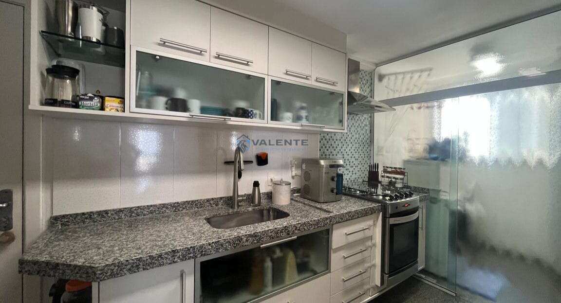 A cozinha é completa em planejados, funcional e bem distribuída, além de área de serviço espaçosa e despensa. O imóvel dispõe ainda de 2 vagas de garagem e 1 box privativo.